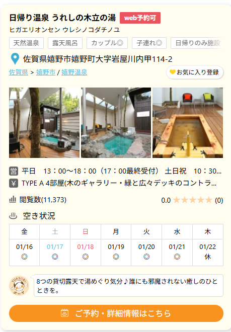 日帰り温泉 うれしの木立の湯の「日帰り貸切露天風呂」は、全8タイプから選べるプライベート空間が魅力。